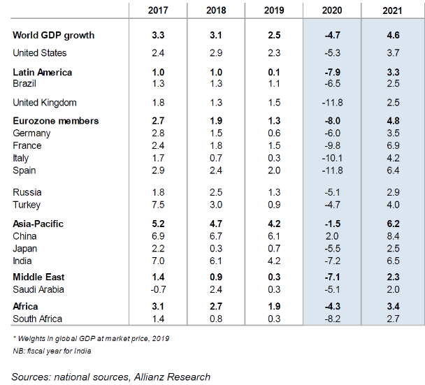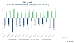The decline in global GDP in 2020 will ultimately depend on any additional measures taken before the end of the year. However, insurance companies basically agreed that it will move at the level of -4.7 to -4.8%, with the fact that in 2021 part of the losses should be compensated by growth of 4.4 to 4.6%. The current situation has significantly different effects on individual countries and their economies. The expected development is summarized in the attached graphs.