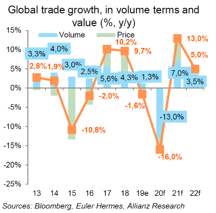 World trade in goods is recovering from the first wave faster than it was during the last economic crisis in 2009. However, it is clear that services have been hit harder in this regard and many sectors still have a question mark over the current development of the measures. Global trade will decline by 13% in 2020, which is 2 percentage points less than the first half forecast. In 2021, on the other hand, trade should grow by 7%.