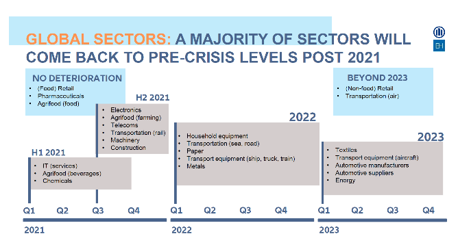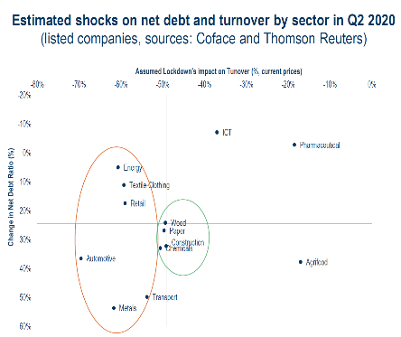 There are industries that were only minimally affected by the crisis. In some cases, industries even grew during the crisis. This is mainly about agriculture and the pharmaceutical industry. The IT, chemical industry and construction industries should also deal with the crisis relatively well and quickly. On the contrary, the automotive sector, whose problems started before the crisis, metallurgy, the energy and textile industries, air transport and retail, with the exception of food, are significantly affected. The graph from EH shows the estimated length of recovery, and the graph from Coface shows the impact on the turnover and indebtedness of individual sectors.