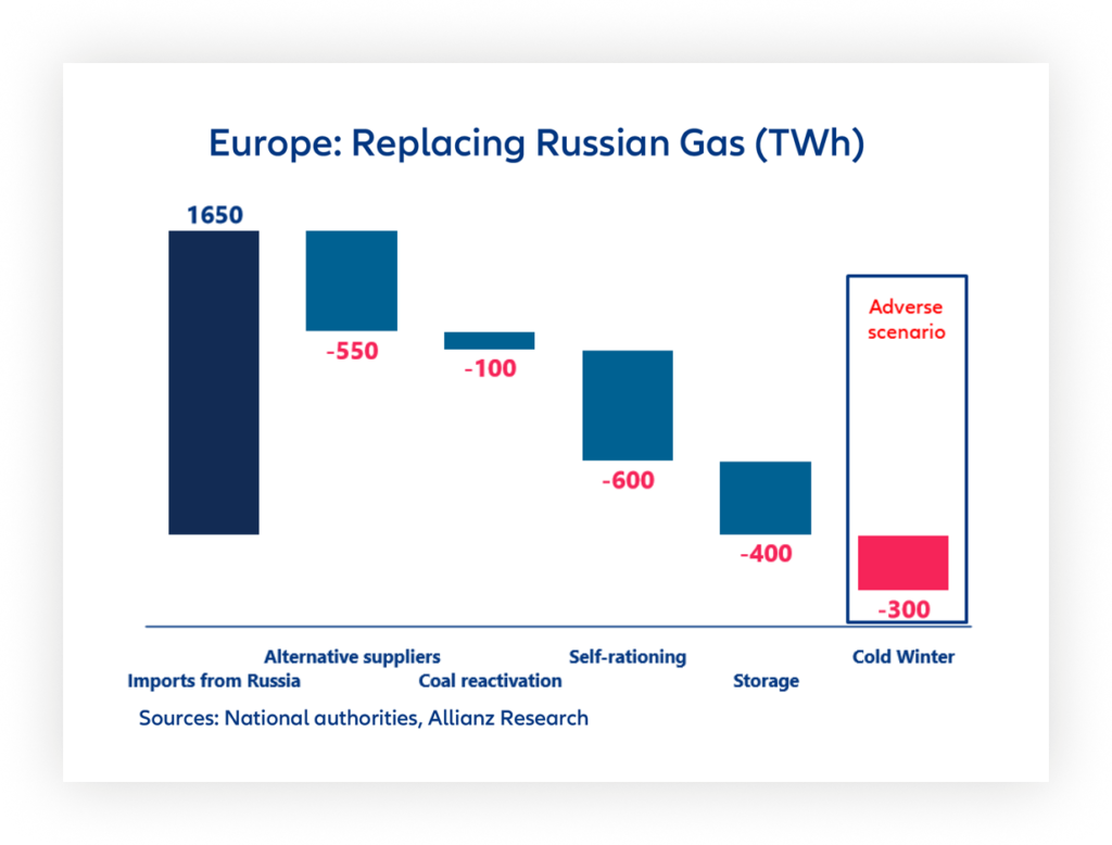 V této souvislosti je zajímavý graf prezentovaný společností Allianz, z něhož vyplývá, že na náhradě dodávek ruského plynu se mají celkově z více než třetiny podílet úsporná opatření. Naopak méně než třetinu tvoří alternativní zdroje dodávek. Představené schéma ale platí jen v případě mírné zimy. Pokud bude letošní zima tuhá, vznikne deficit ve výši až 300 TWh. To je špatná zpráva zejména pro země našeho regionu, které mají energeticky náročné hospodářství. Aktuálně nepříznivá situace se projeví na jejich ekonomickém vývoji markantněji: