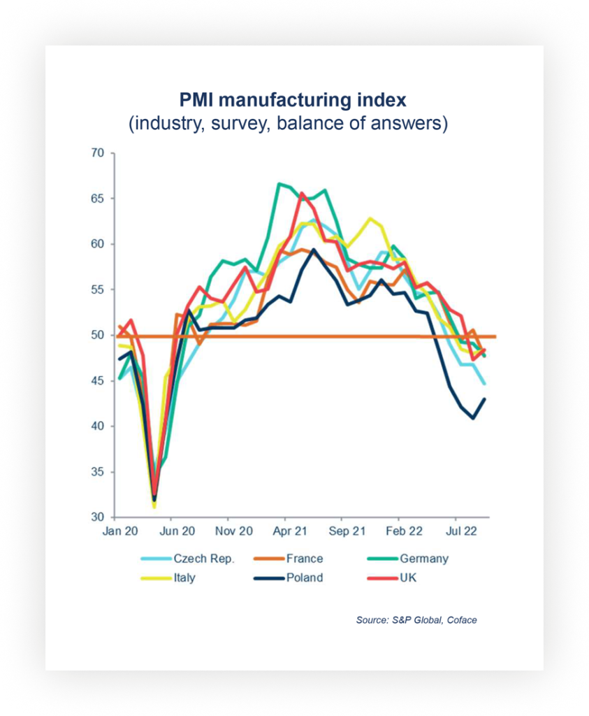 Tyto předpovědi pochopitelně nijak nezlepšují náladu v podnikatelském prostředí. Co je však ještě více alarmující a jen to potvrzuje oprávněnost očekávání dalšího zpomalování ekonomiky v roce 2023, je index PMI (Index nákupních manažerů). Tento ukazatel se propadl pod úroveň 50, což opět předznamenává blížící se recesi.