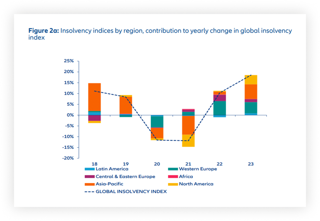 Do toho vstoupila válka na Ukrajině a související energetická krize. Nepřekvapí tak, že se aktuální prognózy nárůstu insolvencí pohybují opět v desítkách procent. Dobrou zprávou prozatím zůstává, že se insolvence v zásadě dostaly jen na úroveň roku 2019. Situace se samozřejmě v různých zemích liší, nicméně globální index se v tomto srovnání drží na úrovni 2 %. Vývoj v oblasti insolvencí dokreslují grafy pojišťovny Allianz: