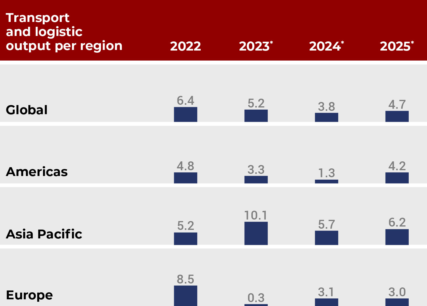 Specifická je situace v Evropě. Zatímco Evropa jako celek rostla v odvětví dopravy a logistiky pouze o 0,3 %, počítá eurozóna za rok 2023 dokonce s poklesem o 1,3 %. Ve Velké Británii je pak pokles ještě výraznější, když činí 2 %. Za těmito výsledky je nutné hledat především zpomalující hospodářský růst doprovázený vysokými cenami energií a inflací. Nižší spotřeba domácností je rovněž důsledkem zpřísnění měnové politiky a vysokých úrokových sazeb. Pokles reportují zejména sektory pozemní dopravy a skladování, zatímco letecká doprava se postupně vzpamatovává z covidu.