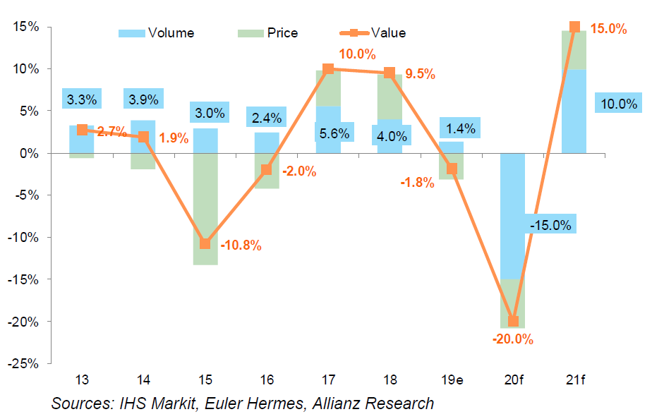 Je to způsobeno zejména tím, že i po návratu do „normálu“ zůstane aktivita v mnohým průmyslových odvětvích v následujících dvou kvartálech pouze na úrovni 70-80 %, aby se udržela reprodukční schopnost viru na úrovni R0. Nemluvě o 20% propadu hodnoty mezinárodního obchodu. Podle popisovaného scénáře by se sice už v následujícím roce měl vrátit k růstové trajektorii s +14.9 %, bude to ale záviset na mnoha okolnostech, jednou z nichž je už i před krizí tak velmi diskutovaný protekcionismus. Je sporné, zda aktuální situace nedonutí jednotlivé země chovat se ještě více protekcionisticky, než tomu bylo před krizí, kdy tento postoj v podstatě zastavil růst mezinárodního obchodu. Kromě toho se budou jednotlivé společnosti ve spolupráci s lokálními vládami snažit přizpůsobovat a měnit dodavatelské řetězce, aby byly schopny pružněji a rychleji zareagovat na takovéto výkyvy. Další faktory, které ovlivní dosažitelnost rychlého opětovného růstu, budou zejména potenciální druhá vlna šíření viru a efektivita státních intervencí na podporu podnikatelského prostředí.