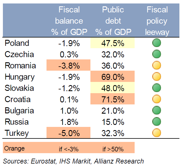 Na rozvíjejících se trzích dojde k prvnímu poklesu ve výkonu ekonomik za posledních 10 let, i když zatím je předpokládaný jen minimální, a to na úrovni -0.5 %. V případě CEE by to mělo být -3.8 %. Schopnost reakce jednotlivých států na aktuální situaci bude záviset i na aktuálním finančním zdraví v jejich hospodaření a schopnosti půjčit si potřebné prostředky na mezinárodních finančních trzích. V tomto směru je situace u rozvíjejících se zemích opravdu pestrá. V následující tabulce můžete najít informaci o některých z nich, zejména ze CEE, z roku 2019: