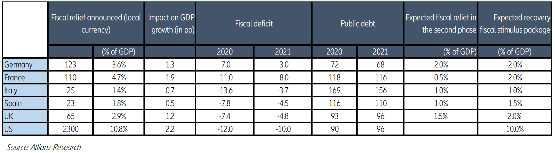Bezprecedentní doba přinesla i bezprecedentní balíky opatření. Fiskální deficity zemí se vyšplhají na dvouciferné úrovně a centrální banky Fed a ECB nafoukly své bilance na 50 % HDP. Veřejný dluh některých zemí se tak dostal do stratosféry, jako je tomu například u Itálie se 169 % HDP a Francie se 118 %. Konkrétní objemy pomoci některých zemí jsou uvedeny v následující tabulce.