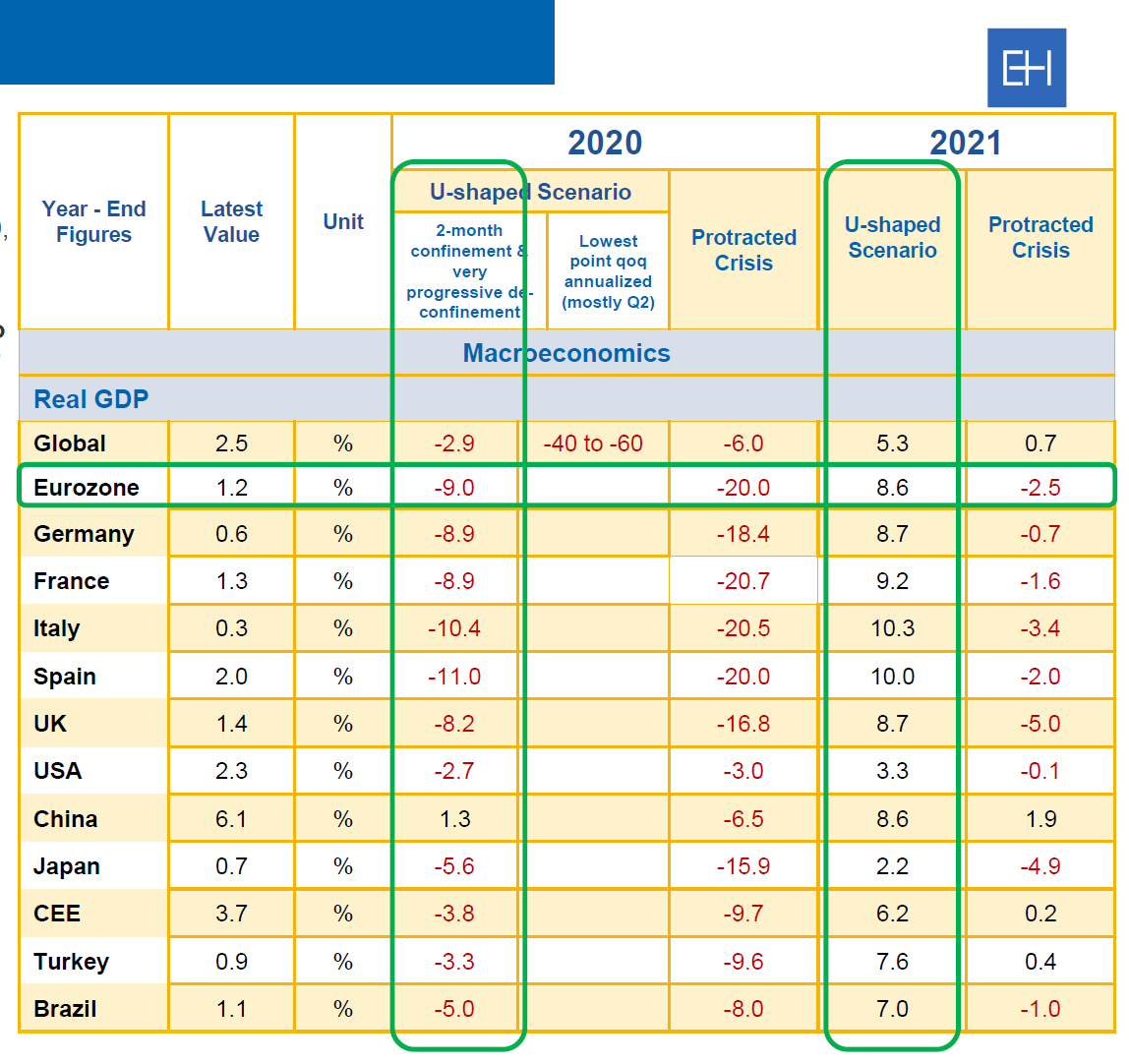 Návrat k předkrizovému normálu v Eurozóně bude trvat minimálně rok. Ve druhém a třetím čtvrtletí se ekonomiky jednotlivých zemí propadnou od 10 do 20 %. Mnohé z opatření proti koronaviru, jako roušky na veřejných místech a v dopravě, trackování a karanténa nakažených, testování a podobně, budou přetrvávat i nadále, což bude mít samozřejmě vliv na výkon ekonomik. Očekávaný návrat k růstu v rámci roku 2021 je také podmíněn vývojem a následnou distribucí účinné vakcíny. V opačném případě se může tato krize překlopit do plíživé, přetrvávající krize, ze které se budeme dostávat několik let.