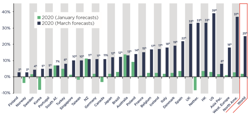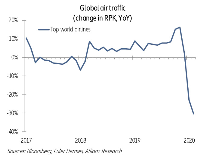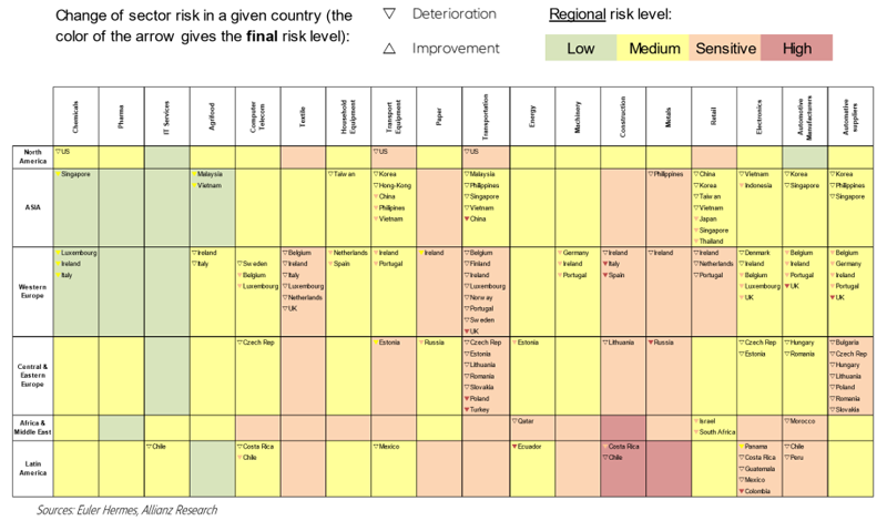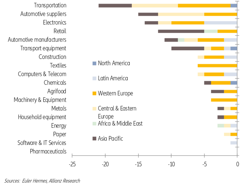 Společnost Euler Hermes, největší specializovaný pojistitel v oblasti obchodního rizika, vydala své nové hodnocení sektorů v jednotlivých zemích. Snížení ratingu zasáhlo rekordních 126 odvětví, což je největší počet od roku 2012, kdy začala tento ukazatel pravidelně plošně vyhodnocovat. Výsledné číslo je kombinací sektoru a země. Ke snížení ratingu daného sektoru mohlo dojít ve více zemích zároveň. Krize spojená s pandemií zasáhla především dopravce, automobilový průmysl, elektroniku a retail.