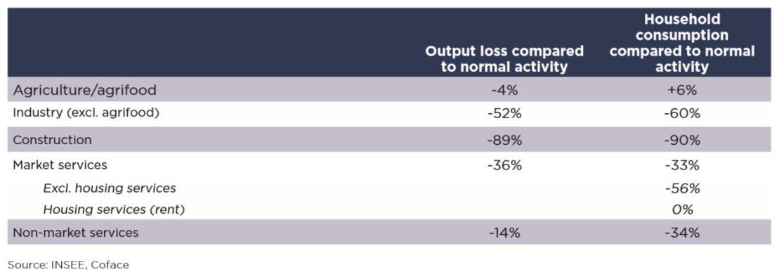 K propadu elektrotechnického průmyslu došlo také zejména z důvodu omezení výrobní kapacity v Číně, která je zodpovědná za kompletaci i výrobu komponentů využívaných v dalších zemích. To se s časovým odstupem projeví také u lokálních výrobců. Výrobní průmysl s negativními očekáváními do roku 2020 už vstupoval. Důvodem byl pomalý růst automobilového průmyslu, ale také segmentu strojů pro zemědělství a těžební průmysl. Aktuální situace zasáhla v první vlně zejména Čínu, která se podílí na 35 % přidané hodnoty v oblasti výroby pro letecký průmysl. K hlavním trhům patří v tomto případě Evropa a USA, které jsou momentálně zamrzlé. Pochopitelně se v tomto seznamu nacházejí také všechna odvětví související s cestovním ruchem. Coface odhaduje 20% propad oproti „jen“ 4% poklesu v roce 2009. Zajímavé je také srovnání posledního březnového týdne s týdnem se standardní aktivitou. Tabulka porovnává výkon některých odvětví a také spotřebu domácností: